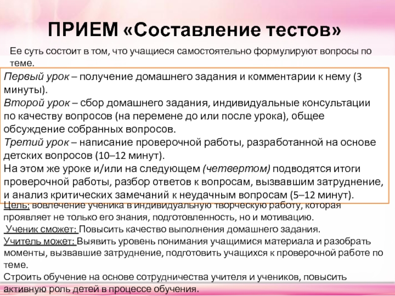 Ее суть состоит в том, что учащиеся самостоятельно формулируют вопросы по теме.