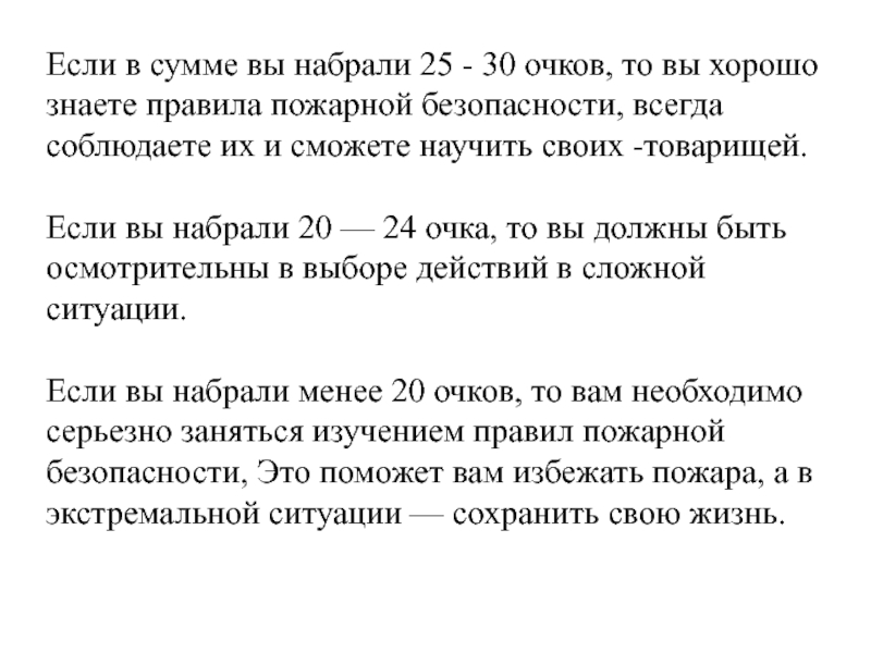 Если вы набрали менее 20 очков, то вам необходимо серьезно заняться изучением правил пожарной безопасности, Это поможет вам избежать пожара, а в экстремальной ситуации — сохранить свою жизнь.