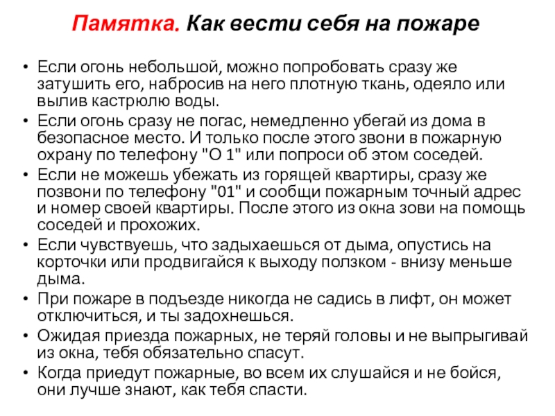 Слайд 9Памятка. Как вести себя на пожаре