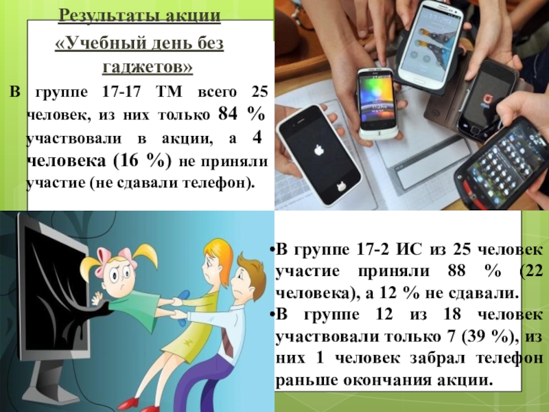 В группе 12 из 18 человек участвовали только 7 (39 %), из них 1 человек забрал телефон раньше окончания акции.
