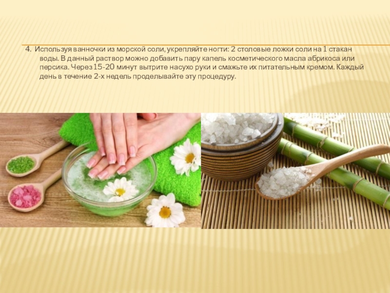 Слайд 314. Используя ванночки из морской соли, укрепляйте ногти: 2 столовые ложки