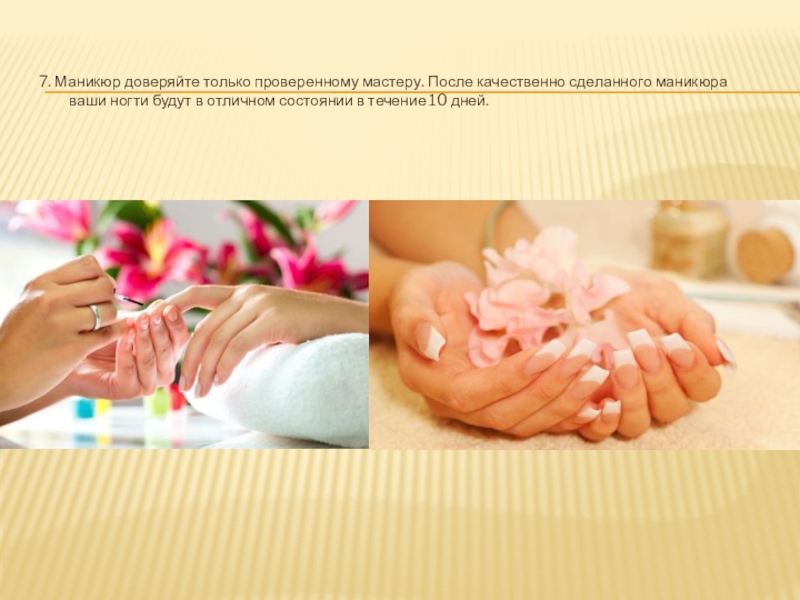 Слайд 347. Маникюр доверяйте только проверенному мастеру. После качественно сделанного маникюра ваши
