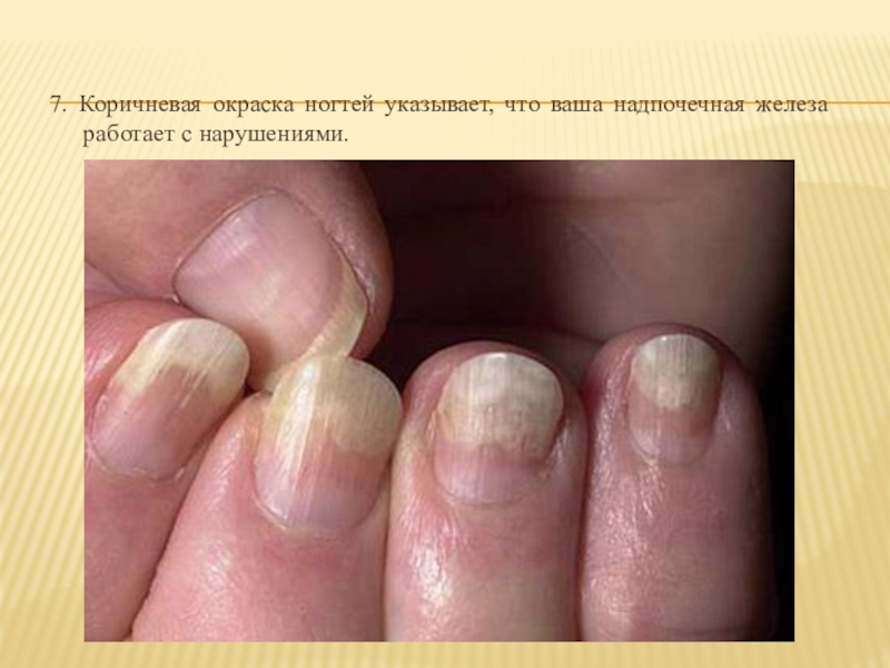 Слайд 137. Коричневая окраска ногтей указывает, что ваша надпочечная железа работает с