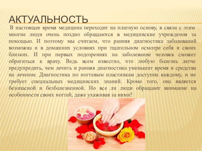 с этим многие люди очень поздно обращаются в медицинские учреждения за помощью. И поэтому мы считаем, что ранняя диагностика заболеваний возможна и в домашних условиях при тщательном осмотре себя и своих близких. И при первых подозрениях на заболевание человек сможет обратиться к врачу. Ведь всем известно, что любую болезнь легче предупредить, чем лечить и ранняя диагностика уменьшит время и средства на лечение. Диагностика по ногтевым пластинкам доступна каждому, и не требует специальных медицинских знаний. Кроме того, она является безопасной и безболезненной. Но все ли люди обращают внимание на особенности своих ногтей, даже ухаживая за ними?