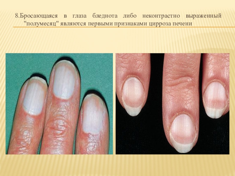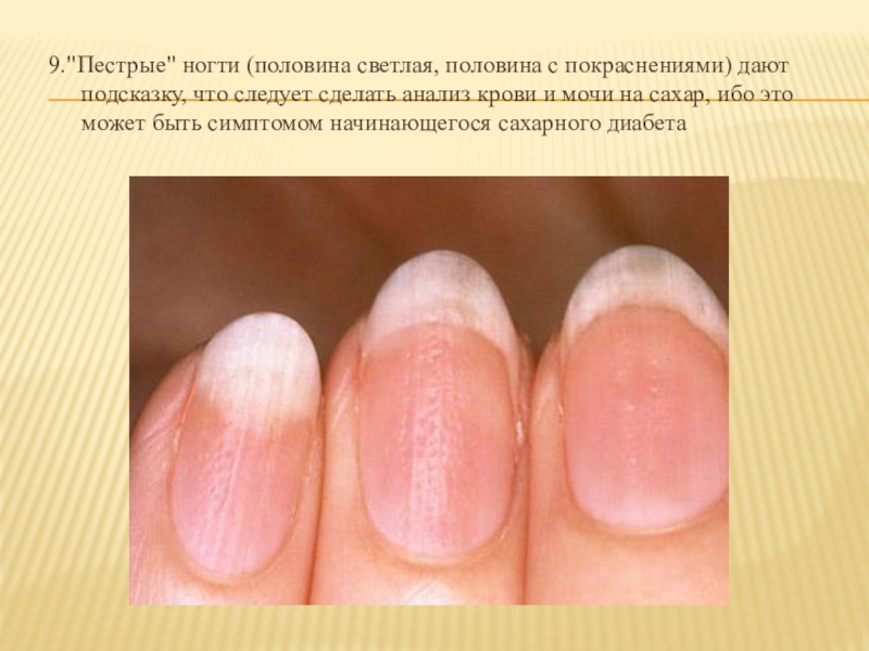 Слайд 159."Пестрые" ногти (половина светлая, половина с покраснениями) дают подсказку, что следует