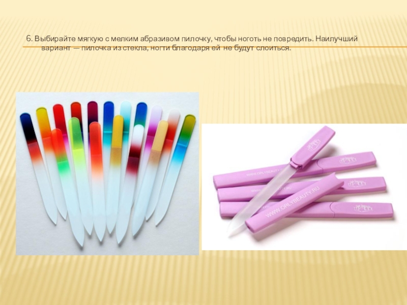 Слайд 336. Выбирайте мягкую с мелким абразивом пилочку, чтобы ноготь не повредить.