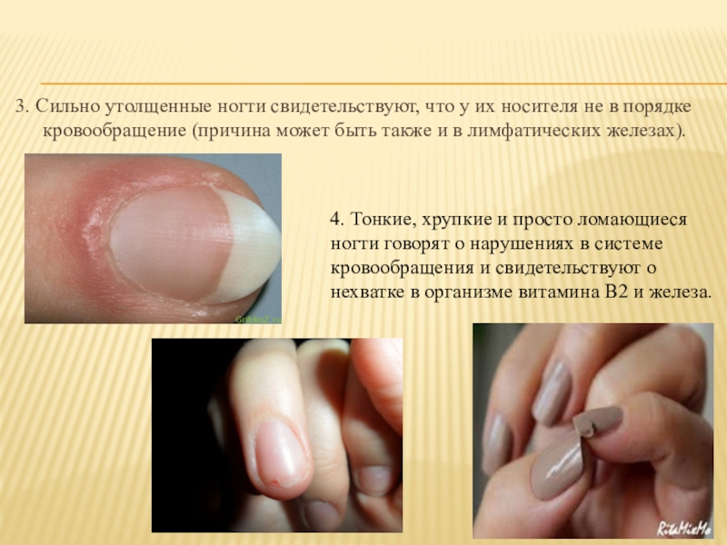 4. Тонкие, хрупкие и просто ломающиеся ногти говорят о нарушениях в системе кровообращения и свидетельствуют о нехватке в организме витамина В2 и железа.