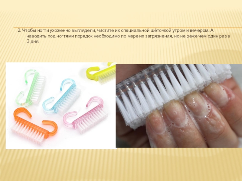Слайд 292. Чтобы ногти ухоженно выглядели, чистите их специальной щёточкой утром и