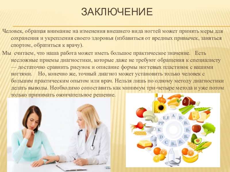 Мы считаем, что наша работа может иметь большое практическое значение. Есть несложные приемы диагностики, которые даже не требуют обращения к специалисту — достаточно сравнить рисунок и описание формы ногтевых пластинок с вашими ногтями. Но, конечно же, точный диагноз может установить только человек с большим практическим опытом или врач. Нельзя лишь по одному методу диагностики делать выводы. Необходимо сопоставить как минимум три-четыре метода и уже потом только принимать окончательное решение.