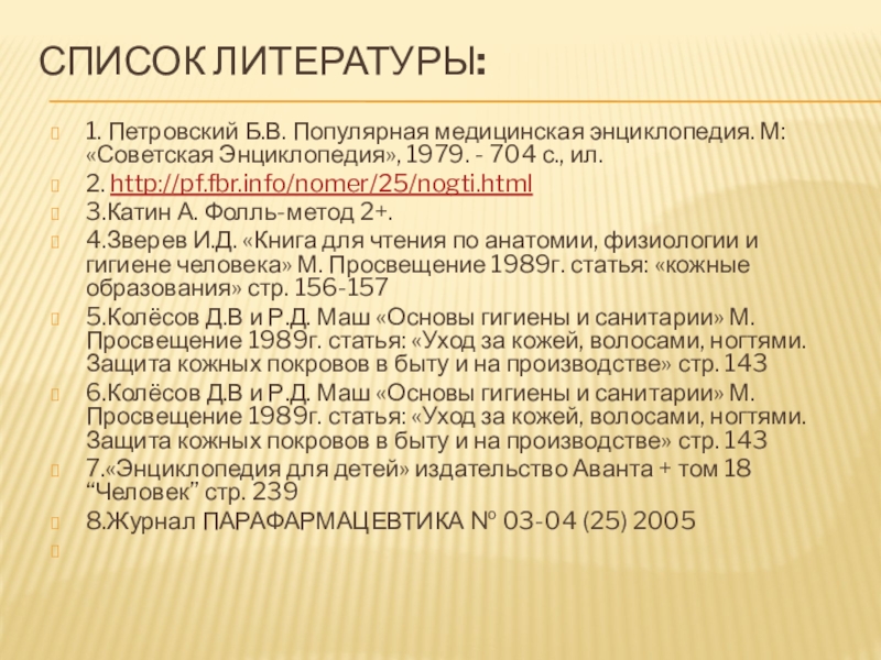 4.Зверев И.Д. «Книга для чтения по анатомии, физиологии и гигиене человека» М. Просвещение 1989г. статья: «кожные образования» стр. 156-157