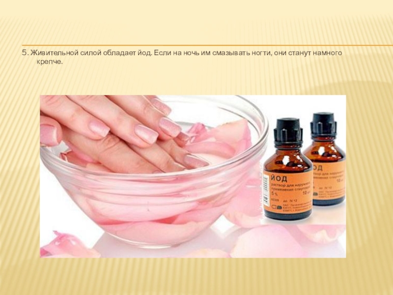 Слайд 325. Живительной силой обладает йод. Если на ночь им смазывать ногти,