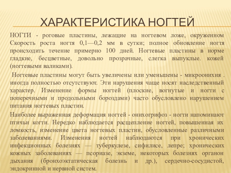роста ногтя 0,1—0,2 мм в сутки; полное обновление ногтя происходить течение примерно 100 дней. Ногтевые пластины в норме гладкие, бесцветные, довольно прозрачные, слегка выпуклые. кожей (ногтевыми валиками).
