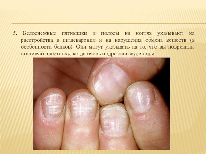 пищеварении и на нарушения обмена веществ (в особенности белков). Они могут указывать на то, что вы повредили ногтевую пластинку, когда очень подрезали заусеницы.