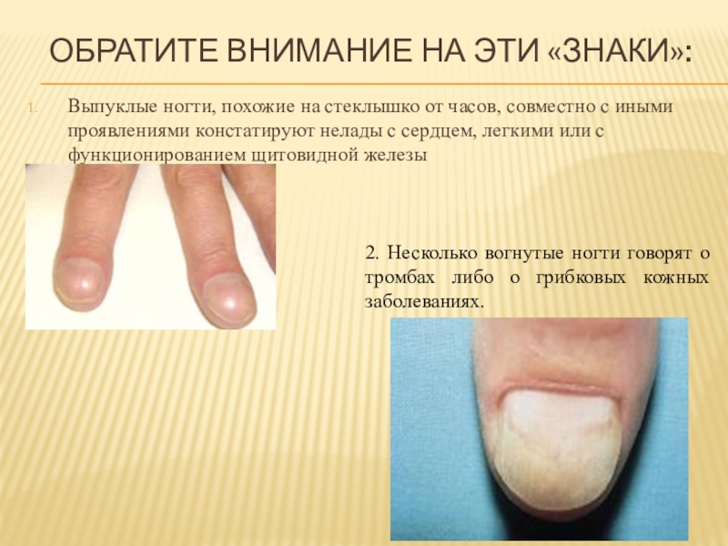 2. Несколько вогнутые ногти говорят о тромбах либо о грибковых кожных заболеваниях.