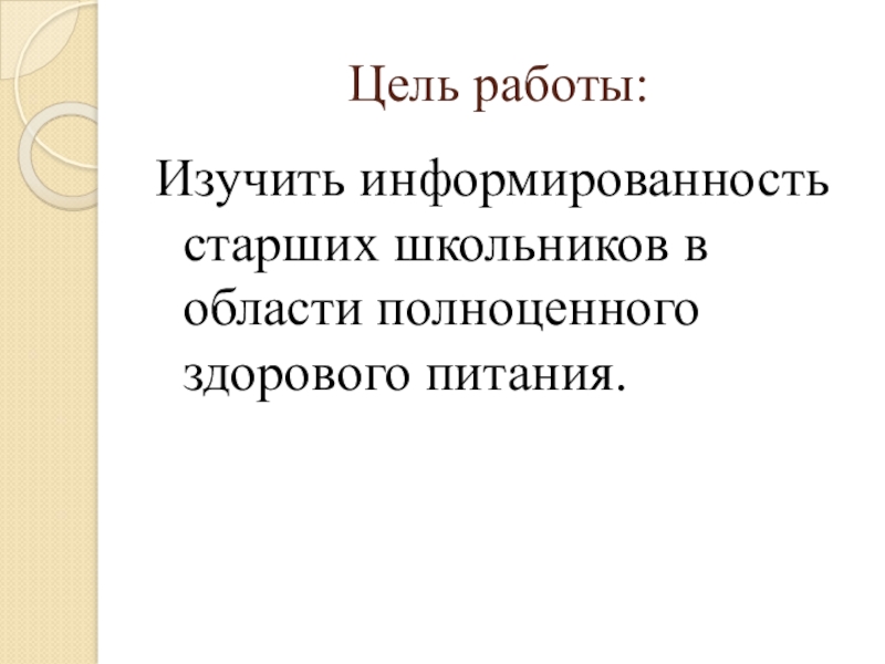 Изучить информированность старших школьников в области полноценного здорового питания.