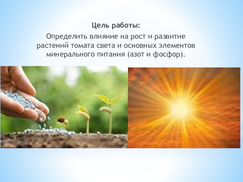 Цель работы: Определить влияние на рост и развитие растений томата света и основных элементов минерального питания (азот и фосфор).