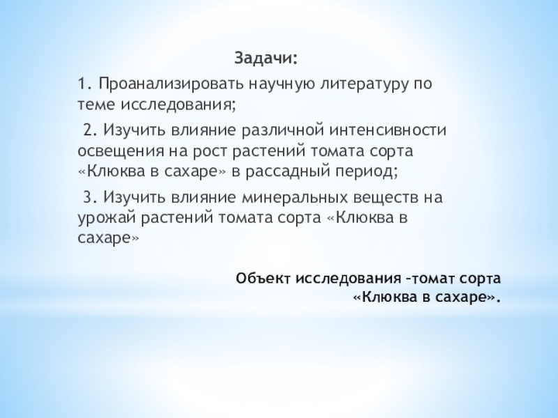 Объект исследования –томат сорта  «Клюква в сахаре». Задачи: 1. Проанализировать научную литературу по теме исследования; 2.