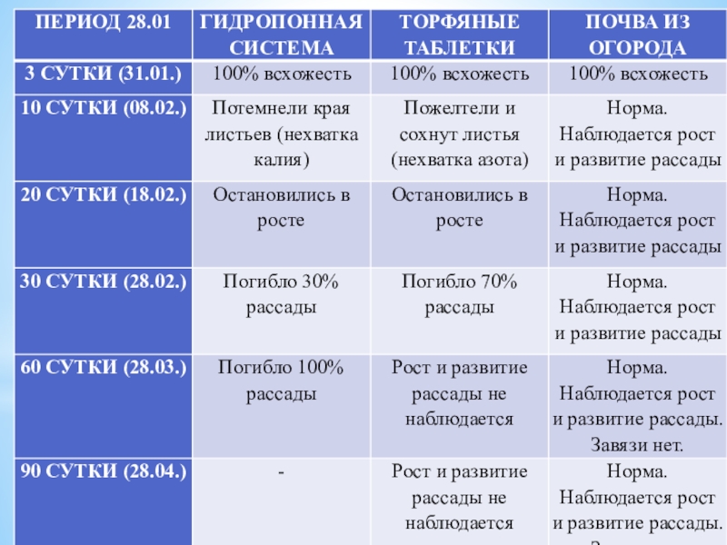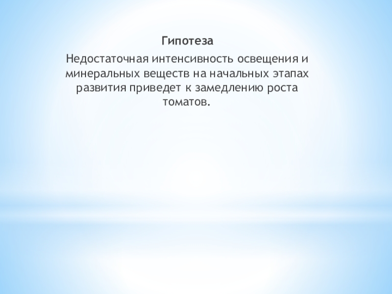 ГипотезаНедостаточная интенсивность освещения и минеральных веществ на начальных этапах развития приведет к замедлению роста томатов.