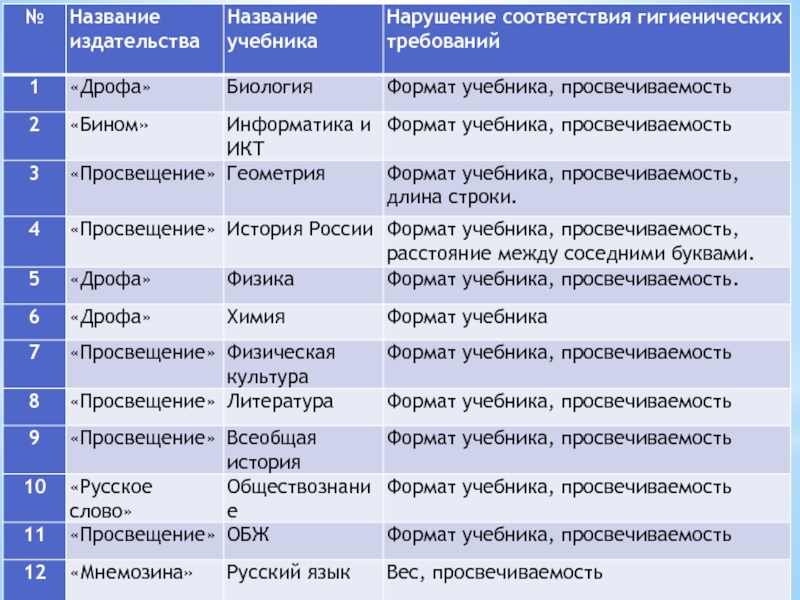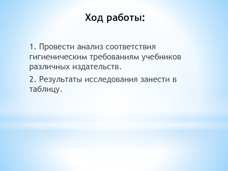 1. Провести анализ соответствия гигиеническим требованиям учебников различных издательств.