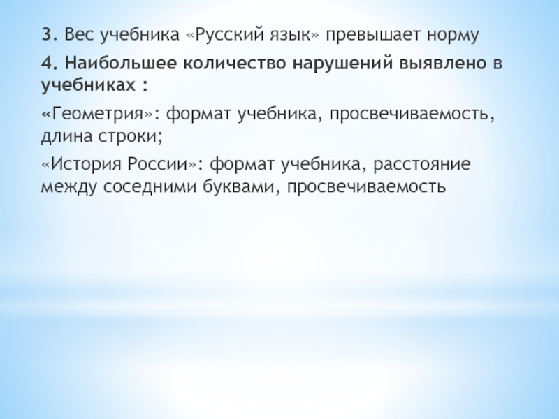 5. Сделать вывод о степени нарушения гигиенических требований, предъявляемых к оформлению школьного учебника.