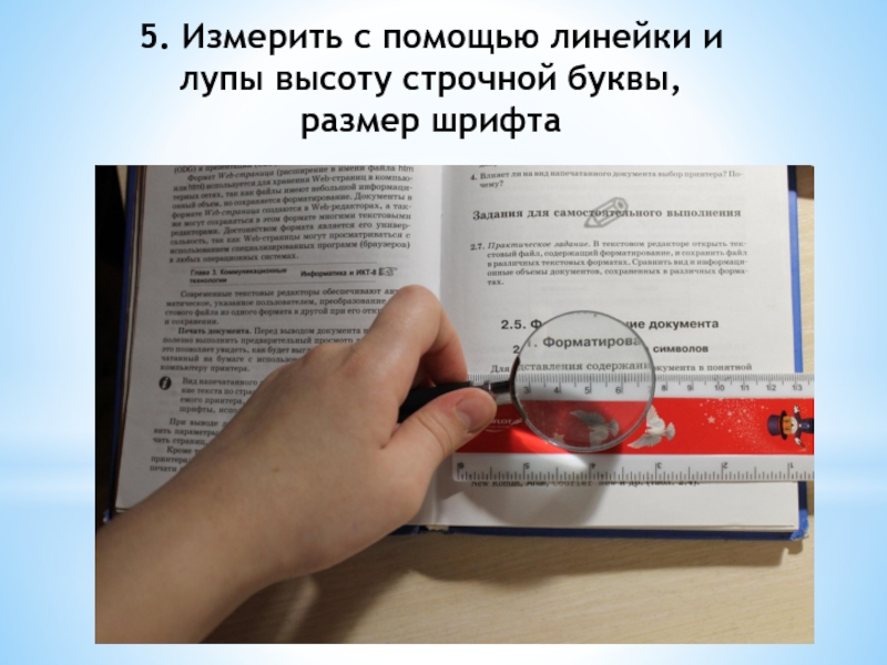 Слайд 155. Измерить с помощью линейки и лупы высоту строчной буквы, размер
