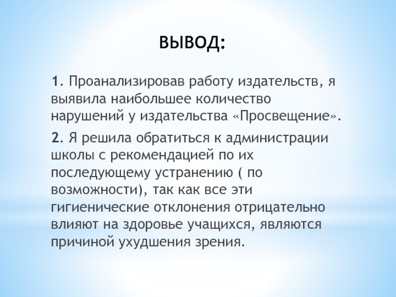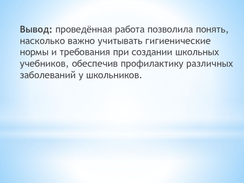 Слайд 19Вывод: проведённая работа позволила понять, насколько важно учитывать гигиенические нормы и