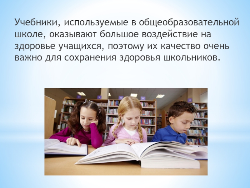 Слайд 24Учебники, используемые в общеобразовательной школе, оказывают большое воздействие на здоровье учащихся,
