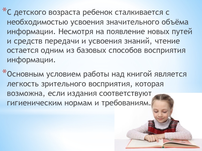 Основным условием работы над книгой является легкость зрительного восприятия, которая возможна, если издания соответствуют гигиеническим нормам и требованиям.