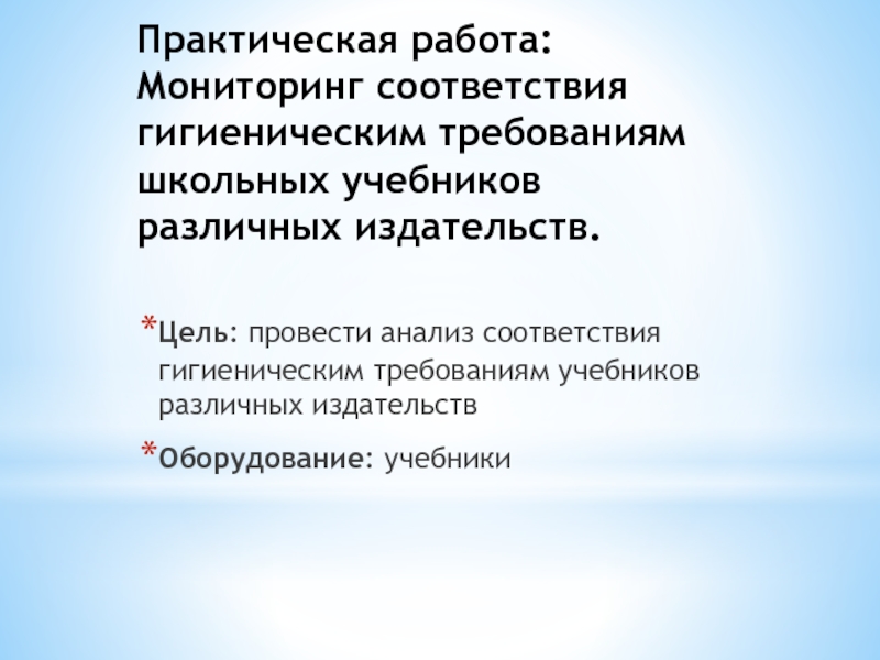Слайд 20Практическая работа: Мониторинг соответствия гигиеническим требованиям школьных учебников различных издательств.