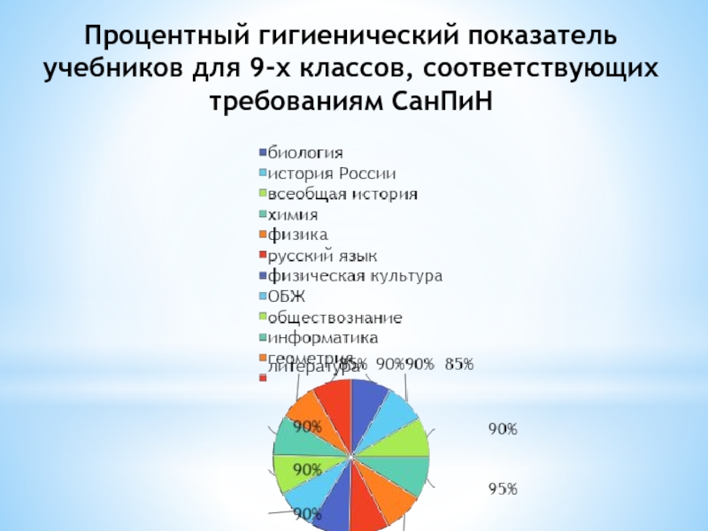 Слайд 18Процентный гигиенический показатель учебников для 9-х классов, соответствующих требованиям СанПиН