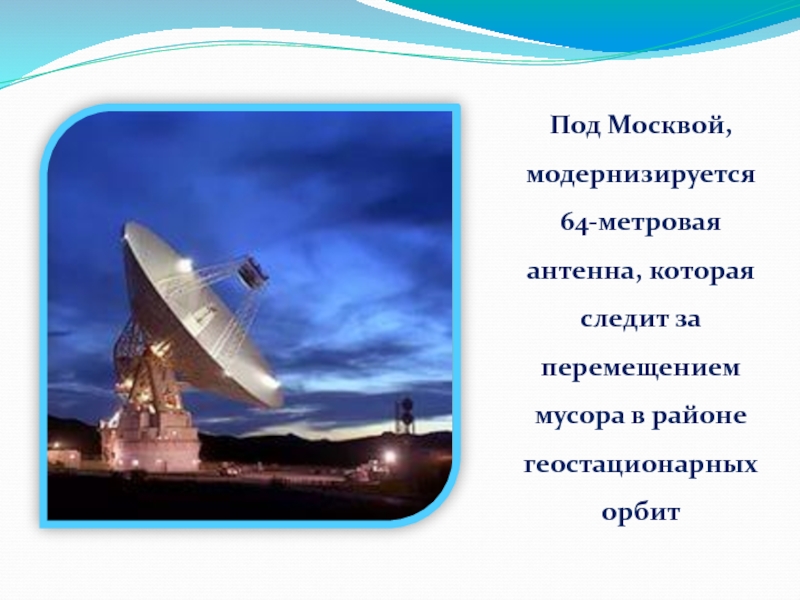 Слайд 15Под Москвой, модернизируется 64-метровая антенна, которая следит за перемещением мусора в