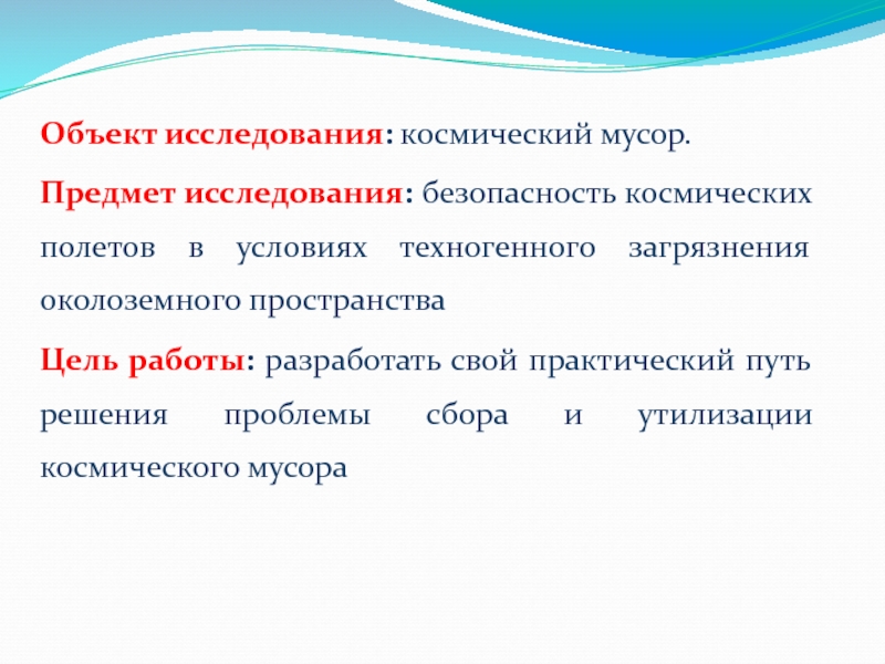 Предмет исследования: безопасность космических полетов в условиях техногенного