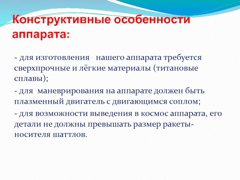 - для возможности выведения в космос аппарата, его детали не должны превышать размер ракеты-носителя шаттлов.