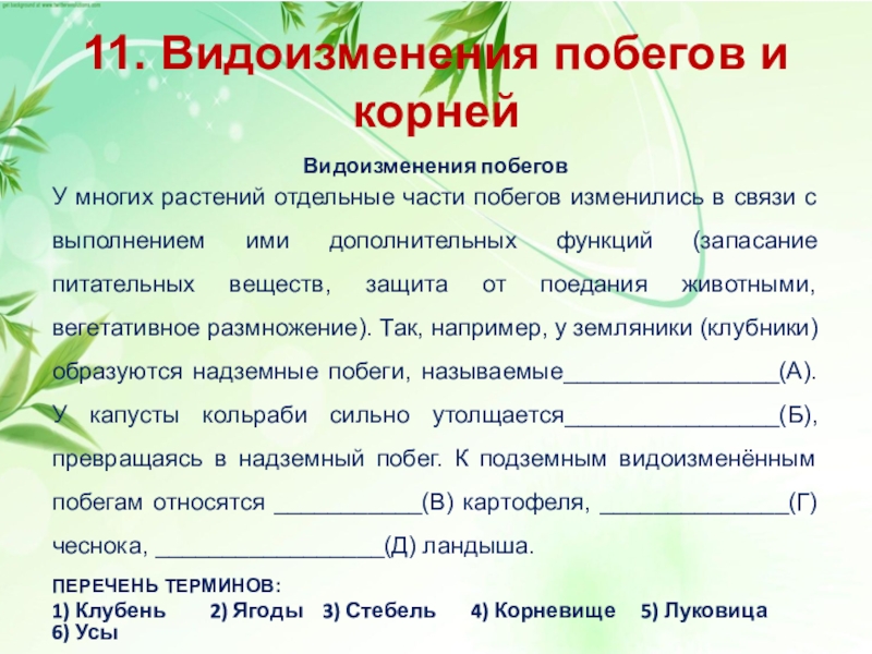изменились в связи с выполнением ими дополнительных функций (запасание питательных веществ, защита от поедания животными, вегетативное размножение). Так, например, у земляники (клубники) образуются надземные побеги, называемые________________(А). У капусты кольраби сильно утолщается________________(Б), превращаясь в надземный побег. К подземным видоизменённым побегам относятся ___________(В) картофеля, ______________(Г) чеснока, _________________(Д) ландыша.