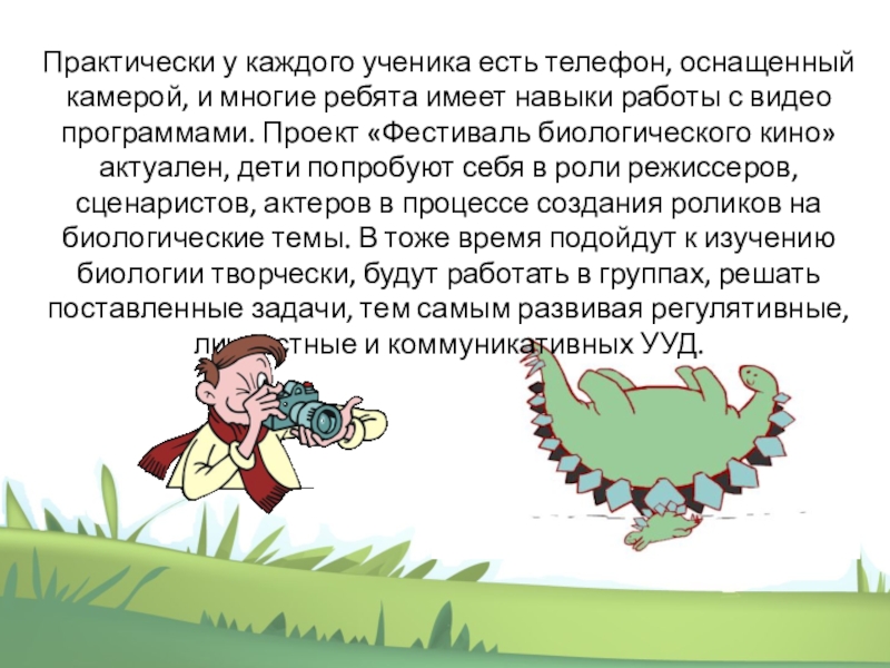имеет навыки работы с видео программами. Проект «Фестиваль биологического кино» актуален, дети попробуют себя в роли режиссеров, сценаристов, актеров в процессе создания роликов на биологические темы. В тоже время подойдут к изучению биологии творчески, будут работать в группах, решать поставленные задачи, тем самым развивая регулятивные, личностные и коммуникативных УУД.