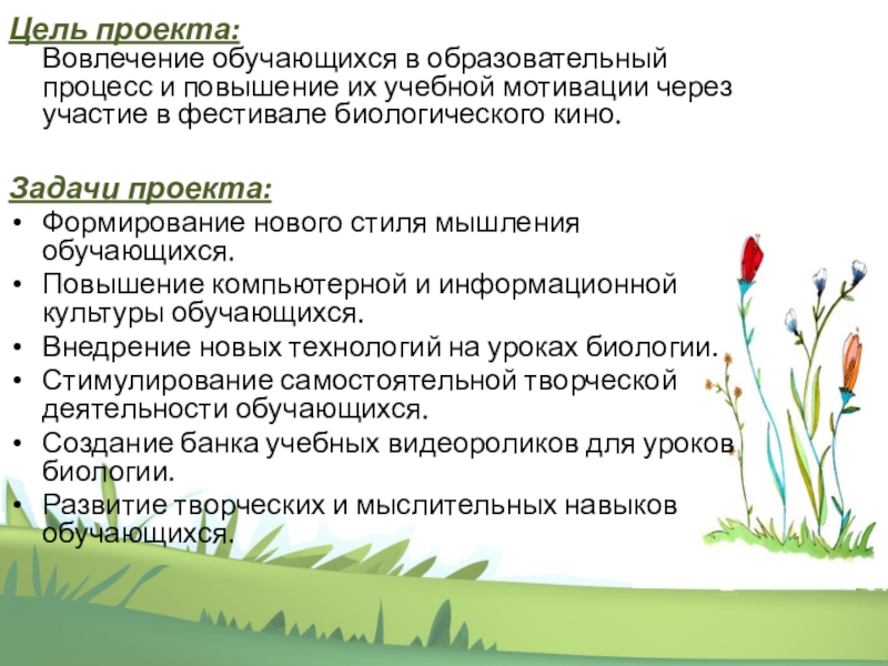 Цель проекта: Вовлечение обучающихся в образовательный процесс и повышение их учебной мотивации через участие в фестивале биологического кино.Задачи проекта:Формирование нового стиля мышления обучающихся.Повышение компьютерной и информационной культуры обучающихся.Внедрение новых технологий на уроках биологии.Стимулирование самостоятельной творческой