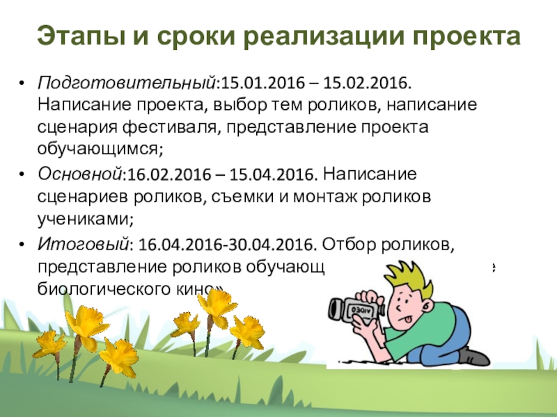Этапы и сроки реализации проектаПодготовительный:15.01.2016 – 15.02.2016. Написание проекта, выбор тем роликов, написание сценария фестиваля, представление проекта