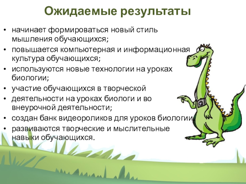 Ожидаемые результатыначинает формироваться новый стиль мышления обучающихся;повышается компьютерная и информационная культура обучающихся;используются новые технологии на уроках биологии;участие