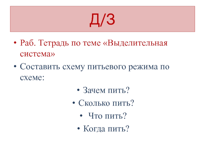 Д/ЗРаб. Тетрадь по теме «Выделительная система» Составить схему питьевого режима по схеме: Зачем пить? Сколько пить? Что