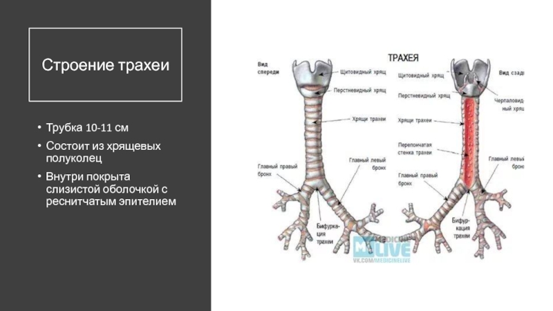 Строение трахеиТрубка 10-11 смСостоит из хрящевых полуколецВнутри покрыта слизистой оболочкой с реснитчатым эпителием