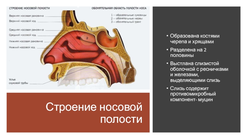 Строение носовой полостиОбразована костями черепа и хрящамиРазделена на 2 половиныВыстлана слизистой оболочкой с ресничками и железами, выделяющими слизьСлизь содержит противомикробный компонент- муцин