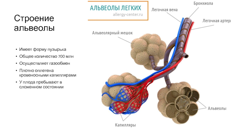 Строение альвеолы Имеет форму пузырькаОбщее количество 700 млнОсуществляет газообменПлотно оплетена кровеносными капиллярамиУ плода пребывают в сложенном состоянии
