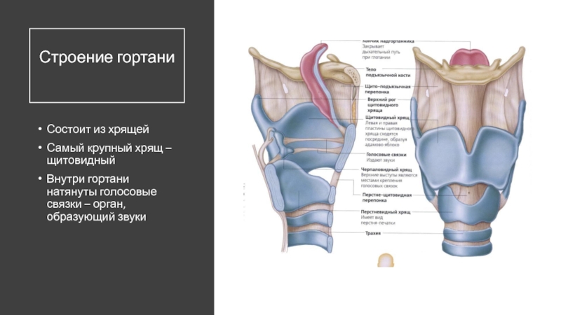 Строение гортани Состоит из хрящейСамый крупный хрящ – щитовидныйВнутри гортани натянуты голосовые связки – орган, образующий звуки