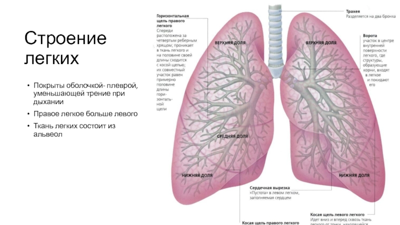 Строение легкихПокрыты оболочкой- плеврой, уменьшающей трение при дыханииПравое легкое больше левогоТкань легких состоит из альвеол