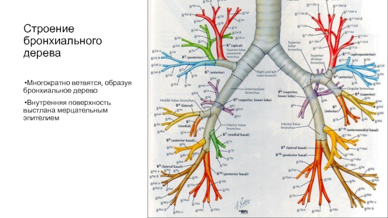 Строение бронхиального дерева Многократно ветвятся, образуя бронхиальное деревоВнутренняя поверхность выстлана мерцательным эпителием