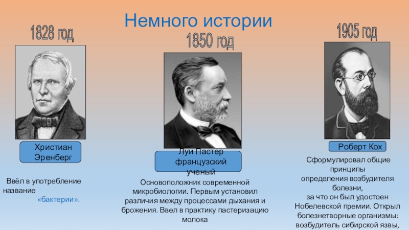 за что он был удостоен Нобелевской премии. Открыл болезнетворные организмы: возбудитель сибирской язвы, туберкулёза, холеры, столбняка. Предложил способы дезинфекции.