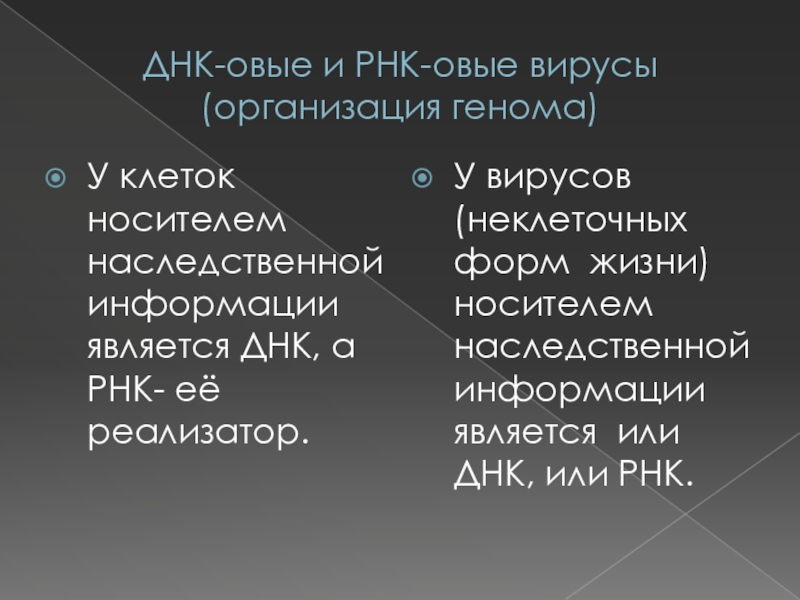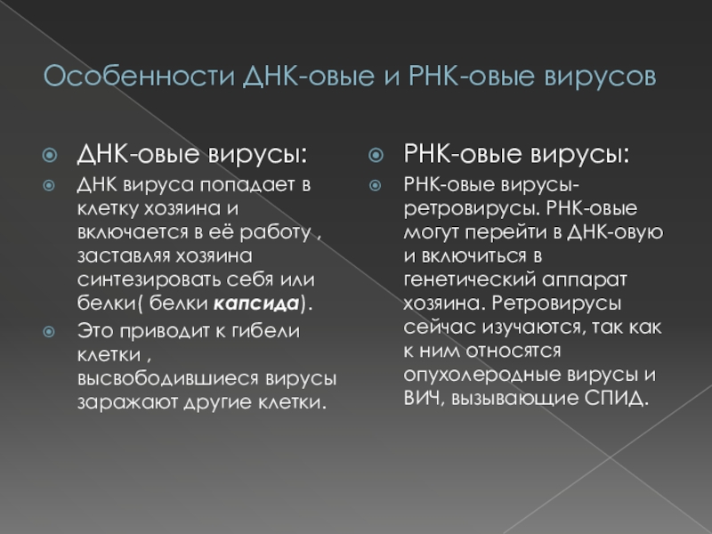 РНК-овые вирусы- ретровирусы. РНК-овые могут перейти в ДНК-овую и включиться в генетический аппарат хозяина. Ретровирусы сейчас изучаются, так как к ним относятся опухолеродные вирусы и ВИЧ, вызывающие СПИД.