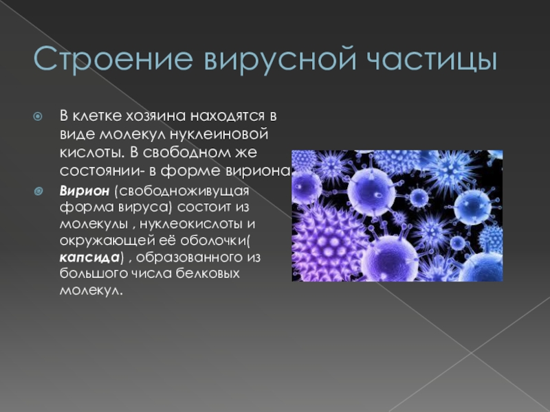 Состоят из нуклеиновой кислоты – ДНК или РНК, белковой оболочки, могут содержать липопротеидную мембрану, углеводы и ферменты( вирус гриппа, герпеса ).