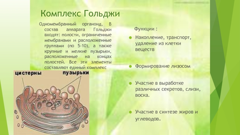 Функции: Транспорт веществ в клетке, разделение клетки на отсеки, синтез белков и других орг. веществ.