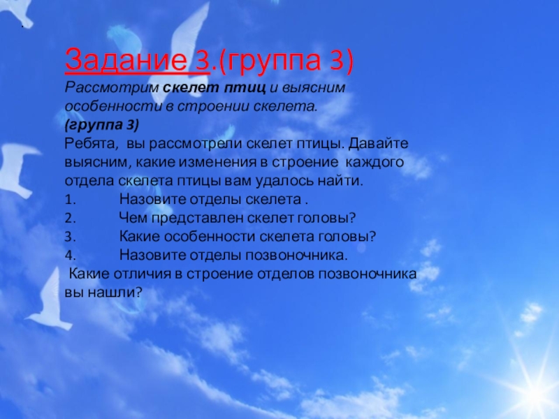 Ребята, вы рассмотрели скелет птицы. Давайте выясним, какие изменения в строение каждого отдела скелета птицы вам удалось найти.
